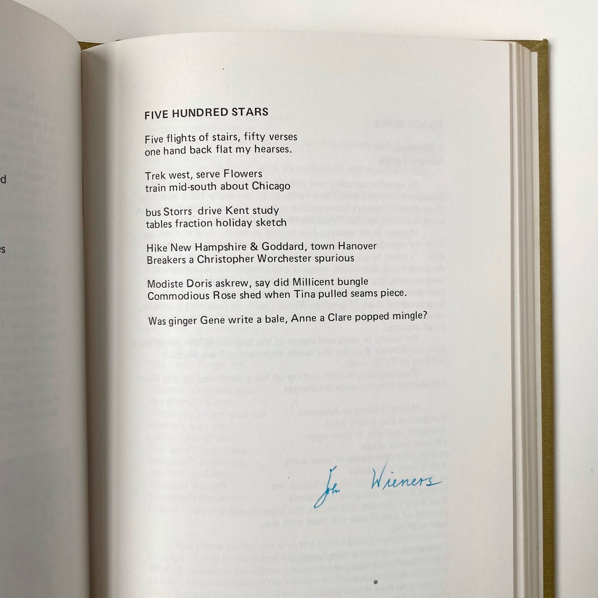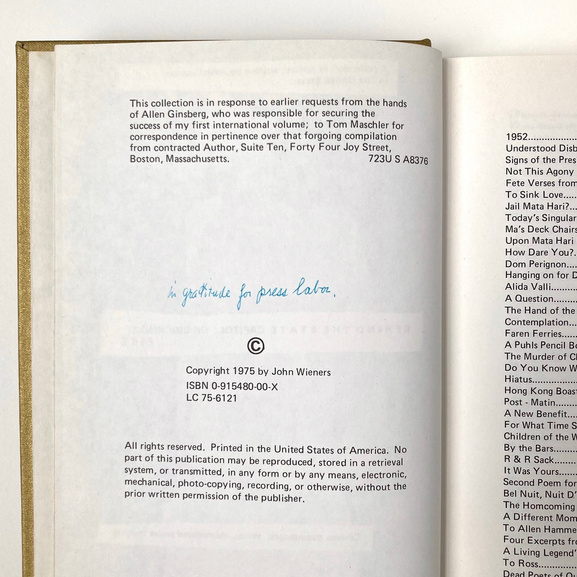 This copy is SIGNED by Wieners on page 91, at the bottom of the poem Five Hundred Stars, and is additionally annotated by Wieners on the copyright page where he writes, “in gratitude for press labor.” Already a scarce book, especially in the limited hardcover edition, this copy is quite unique with Wieners’s signature and note.