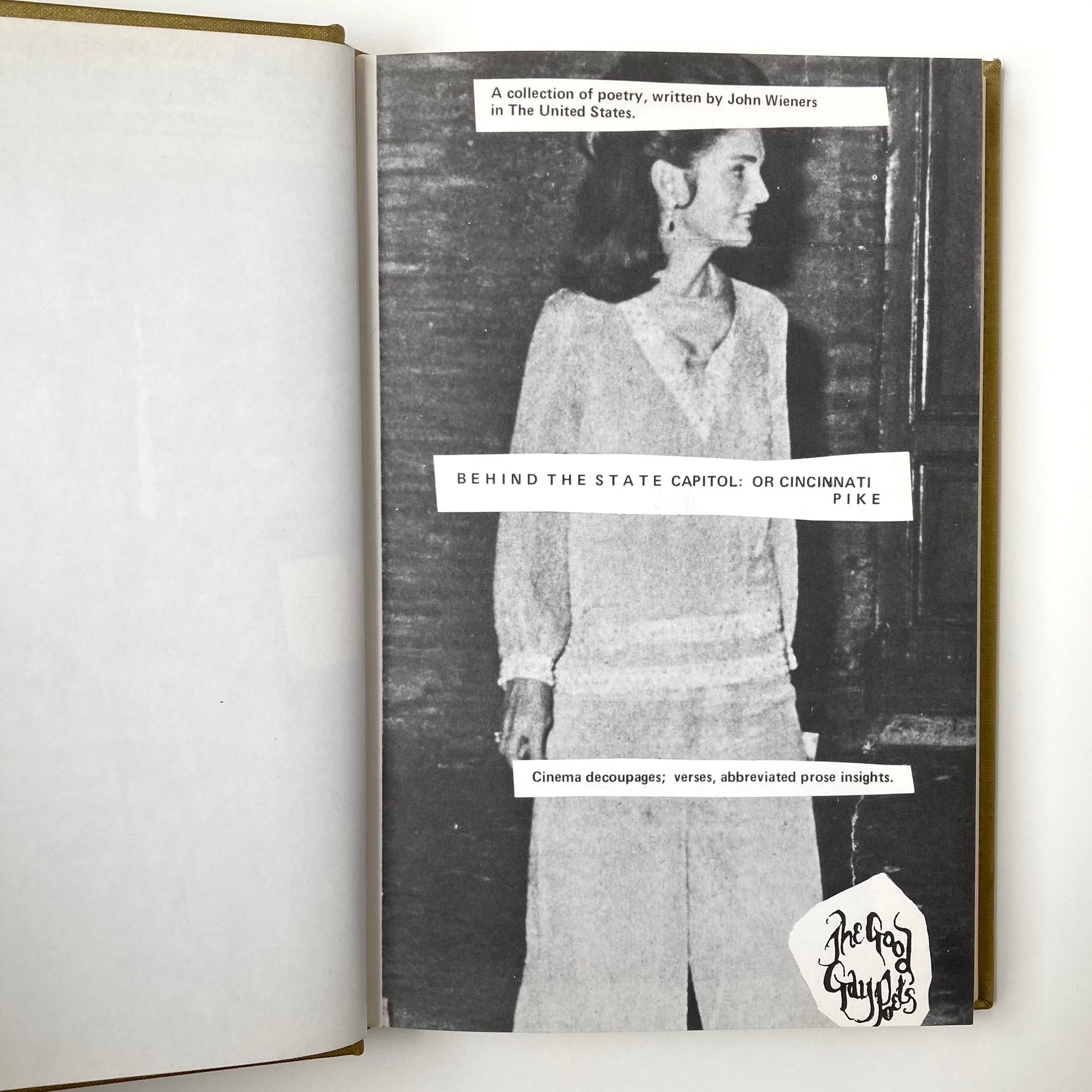 Book measures 5.75 x 8.75 inches. Gold cloth with silver gilt lettering to spine and cover. No dust jacket as issued. “Cinema decoupages; verses, abbreviated prose insights.” One of John Wieners’s scarcest titles, as most remaining copies of the book were destroyed in the arson fire of Fag Rag / Good Gay Poets offices in 1982. Behind the State Capitol is probably Wieners’s most interesting and complicated book, which at times seems to weave in and out of coherence. The use of collage and found imagery interspersed throughout the poems gives this book a deeper sense of Wieners’s state of mind at this point in time, and express the impact of his experiences dealing with poverty, drug addiction, and mental illness.