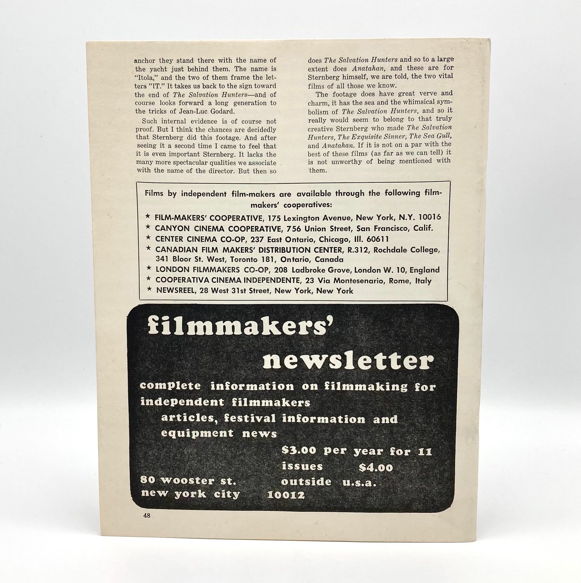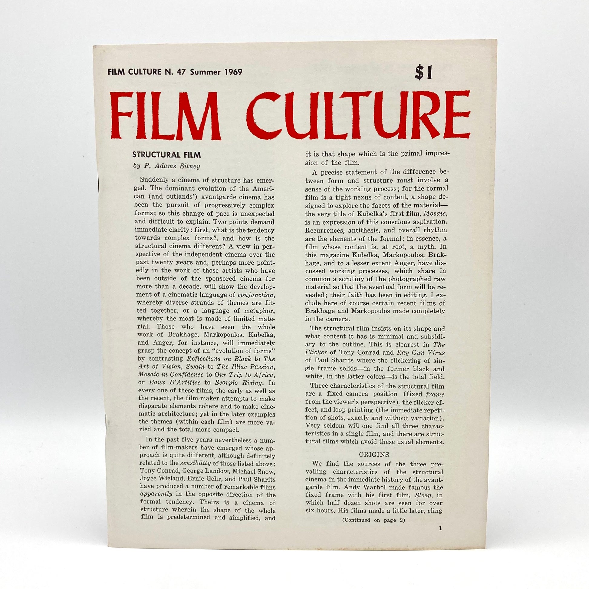 Side stapled wrappers, measuring 8.5 x 11 inches. Summer 1969 issue. Includes P. Adams Sitney's essay on Structural Film. Also includes an interview with Bruce Baillie / Notes on Film by Paul Sharits / The Tibetan Film of the Dead by Ken Kelman / “Mehr Licht” by Robert Creeley / Eastman House Journal by Kirk Bond / Notes on George Landow by P. Adams Sitney among other contributions.