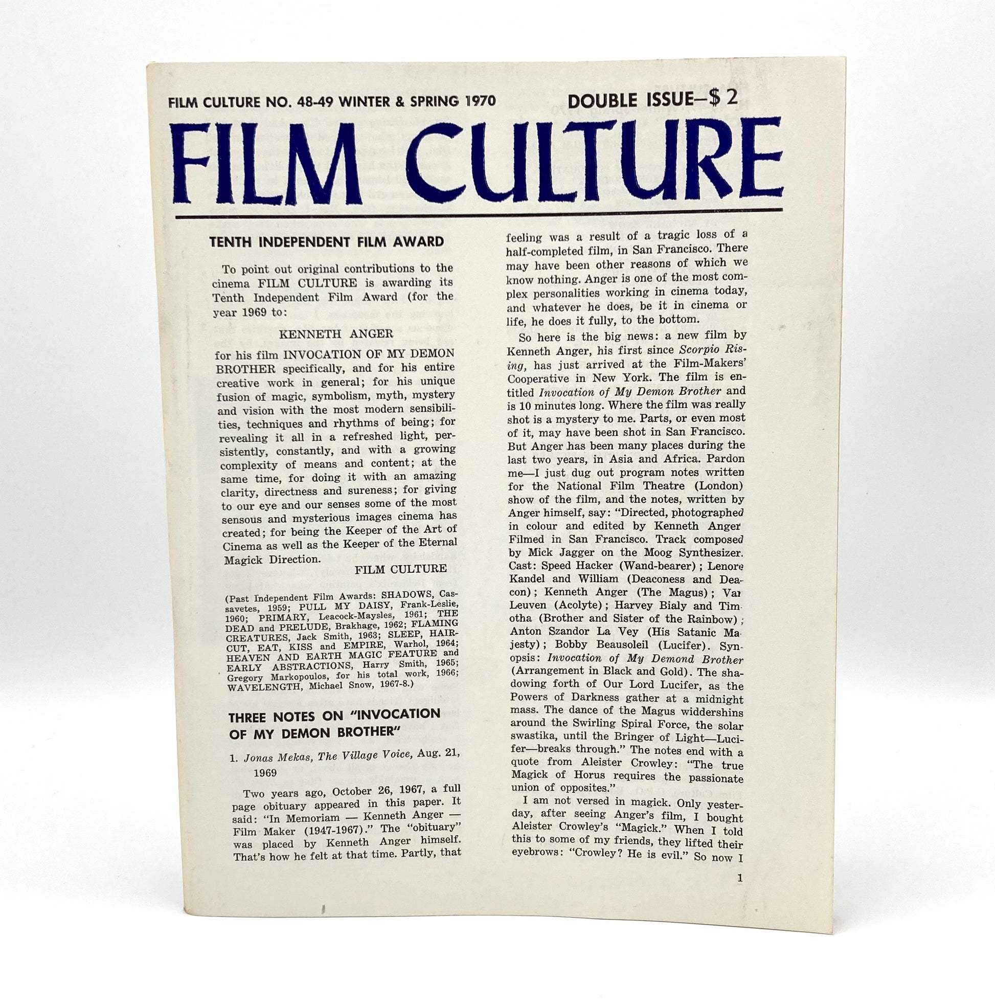 Side stapled wrappers, measuring 8.5 x 11 inches. Winter & Spring 1970, Double Issue. Includes a piece on Kenneth Anger & the Tenth Independent Film Award / Hollis Frampton interview by Michael Snow / The Cosmic Cinema of Jordan Belson by Gene Youngblood / Two Films by Ron Rice by Fred Camper / Yoko Ono on Yoko Ono / and contributions by Stan Vanderbeek, Max Kozloff and many others.