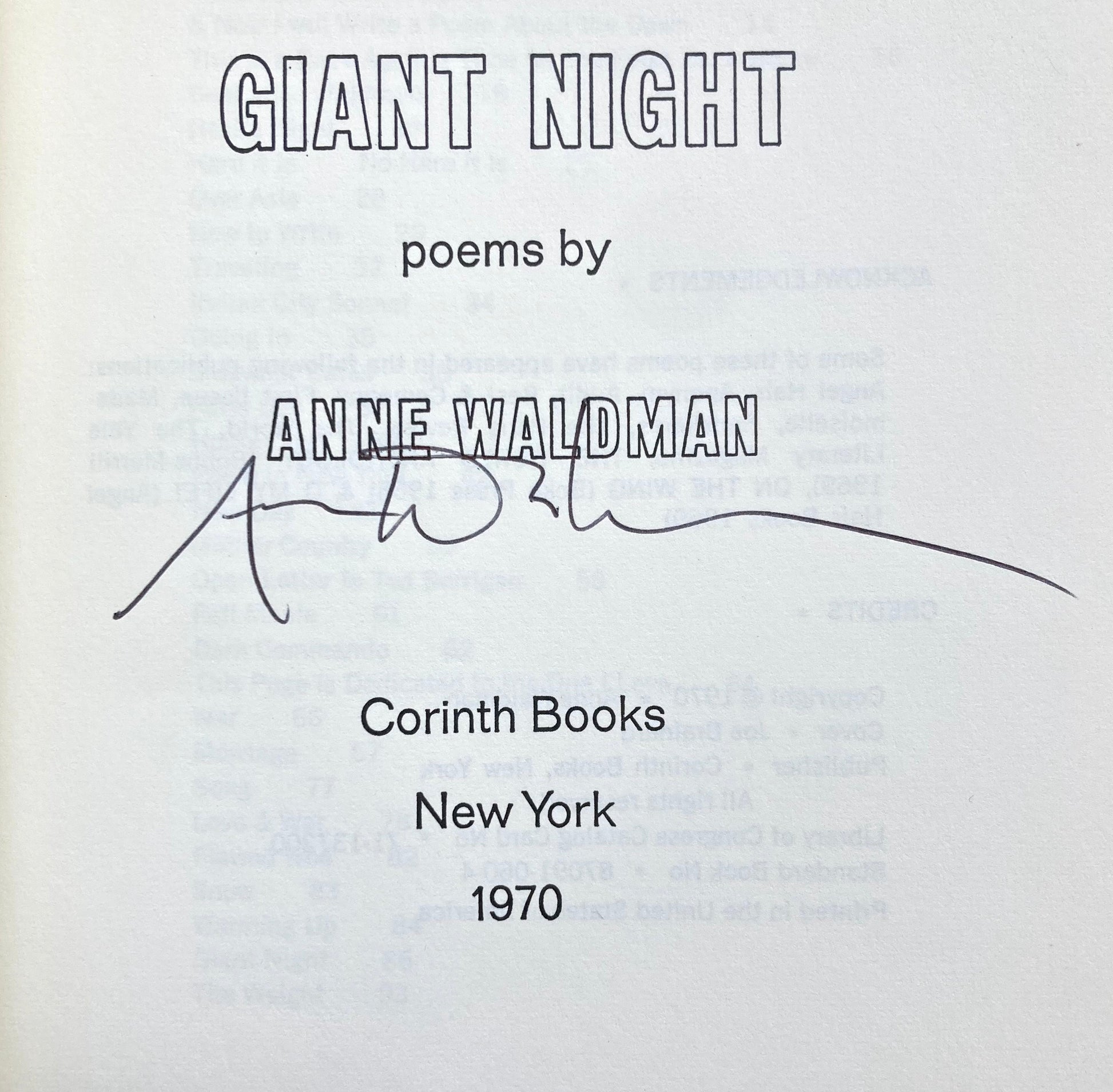 Book measures 6.5 x 8.5 inches. Cover art by Joe Brainard. An expanded trade publication from her earlier mimeograph work with the same name published in 1968. Published in an edition of 1000 copies in cloth. SIGNED by Waldman on the title page. Fine in purple cloth in Near Fine dust jacket. A clean bright copy of this early Waldman book.