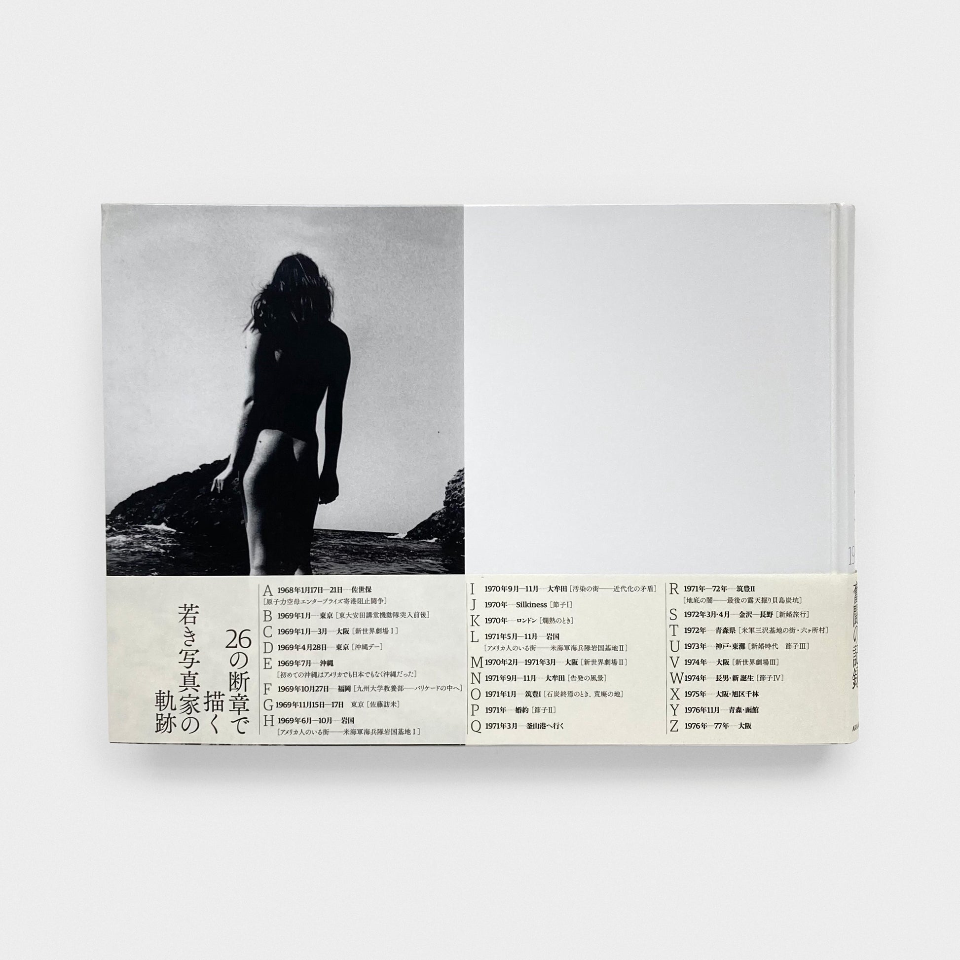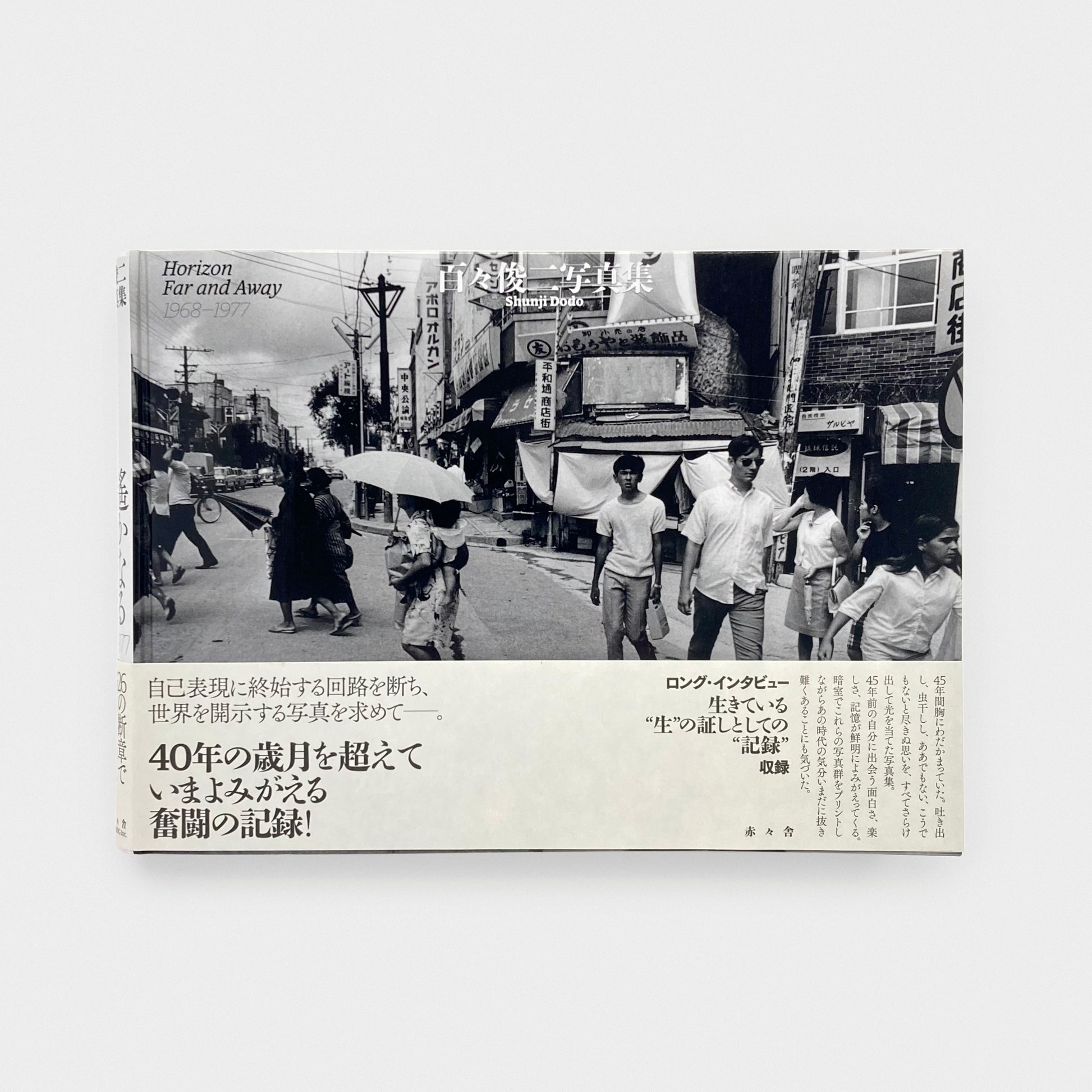 Divided into alphabetical sections, Horizon Far and Away is a visual collection of memories revisited through the existing photographs from his archives. Capturing events such as the students protest at Tokyo University in 1969 to personal moments shared with his wife Setsuko and the birth of his first born son in 1974, the images within serve as both archive and memoir into the years of 1968-1977, a world in which was lived and photographed by Dodo reflecting his photographic journey from a young adult and the many social upturns and changes which would symbolize the era of post-war Japan. Contains an interview in Japanese text only conducted by Suzuki Hiroshi entitled ‘An interview on “memories” as proof of the life I live.’ A Postscript by Shunji Dodo in English text.