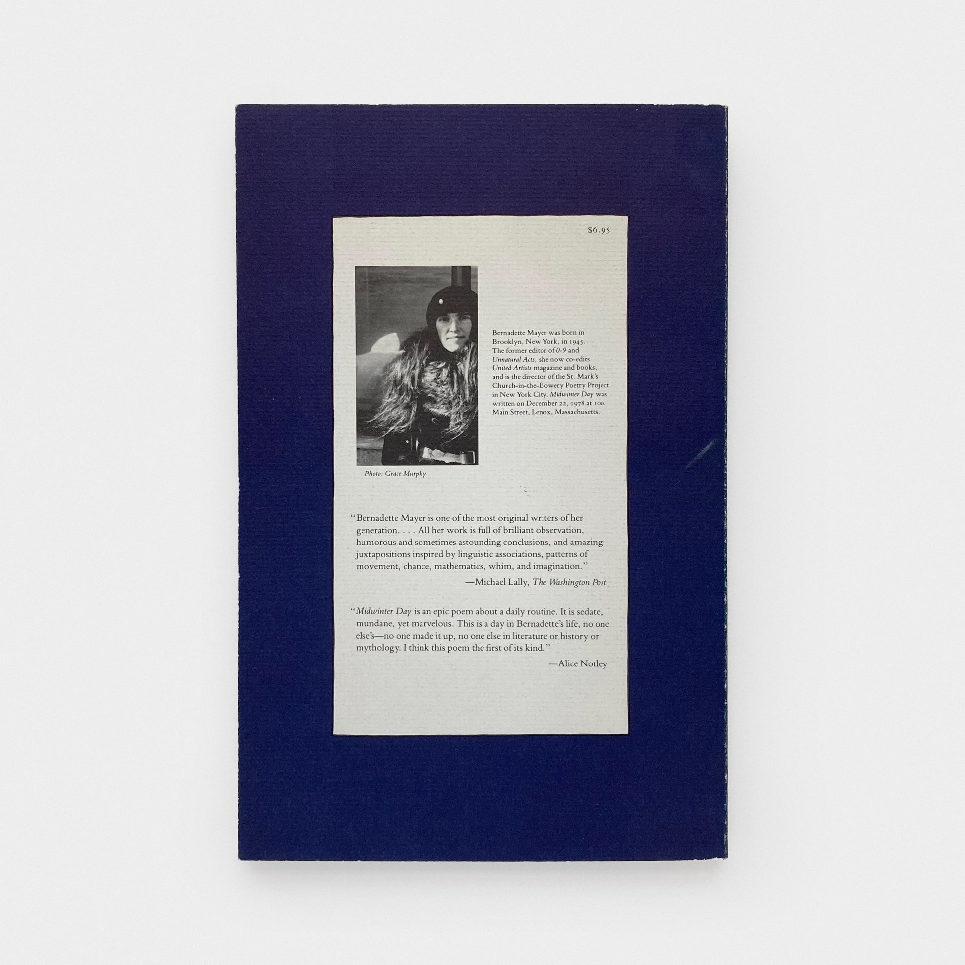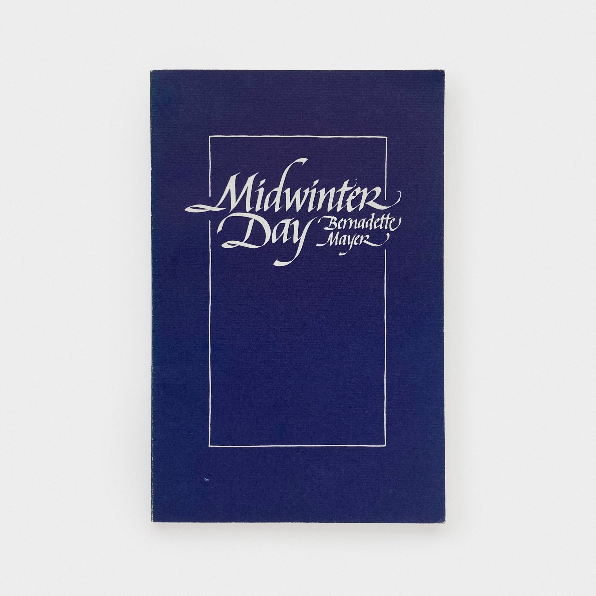 Book measures 7 x 10.75 inches. Printed wrappers. Perhaps Bernadette Mayer’s greatest work, Midwinter Day was written on December 22, 1978 at 100 Main Street, in Lenox, Massachusetts. “Midwinter Day,” as Alice Notley noted, “is an epic poem about a daily routine.” In six parts, Midwinter Day takes us from awakening and emerging from dreams through the whole day—morning, afternoon, evening, night—to dreams again: “. . . a plain introduction to modes of love and reason / Then to end I guess with love, a method to this winter season / Now I’ve said this love it’s all I can remember / Of Midwinter Day the twenty-second of December.” This collection is of one of Mayer’s conceptually structured extended works, which still is celebrated by annual readings of the poem.