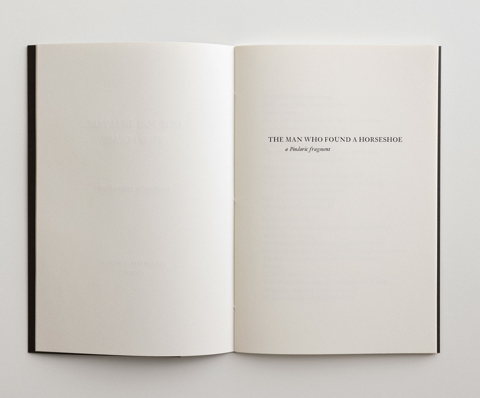 Hand set in Kis-Janson types and printed letterpress by Jon Beacham. Sewn and bound by hand, and laid into a dust jacket with letterpress paste-down label to cover. 24 pages. 6.25 x 9.25 inches. Edition of 175 copies.