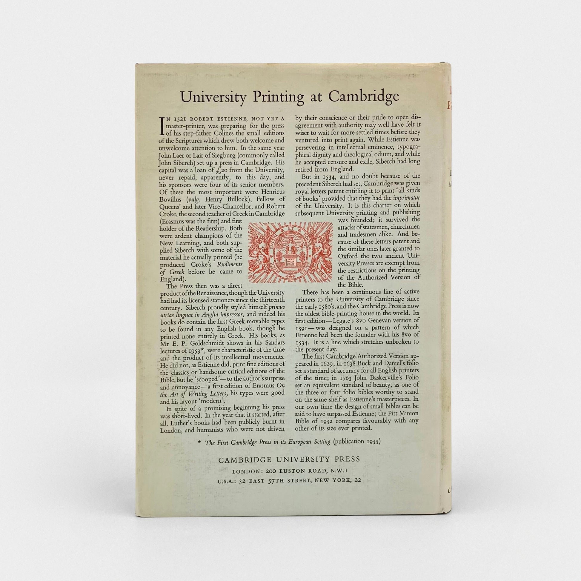 Book measures 7.25 x 10.5 inches. Dark blue buckram with gold gilt lettering to spine and cover. Includes 23 illustration. A beautifully printed volume by the University Press at Cambridge, overseen by Brooke Crutchley. Near Fine in solid binding. Dust jacket is price-clipped, and shows light wear to edges, with one small tear at top spine. Minor signs of rubbing. A well preserved copy. Near Fine / Very Good.