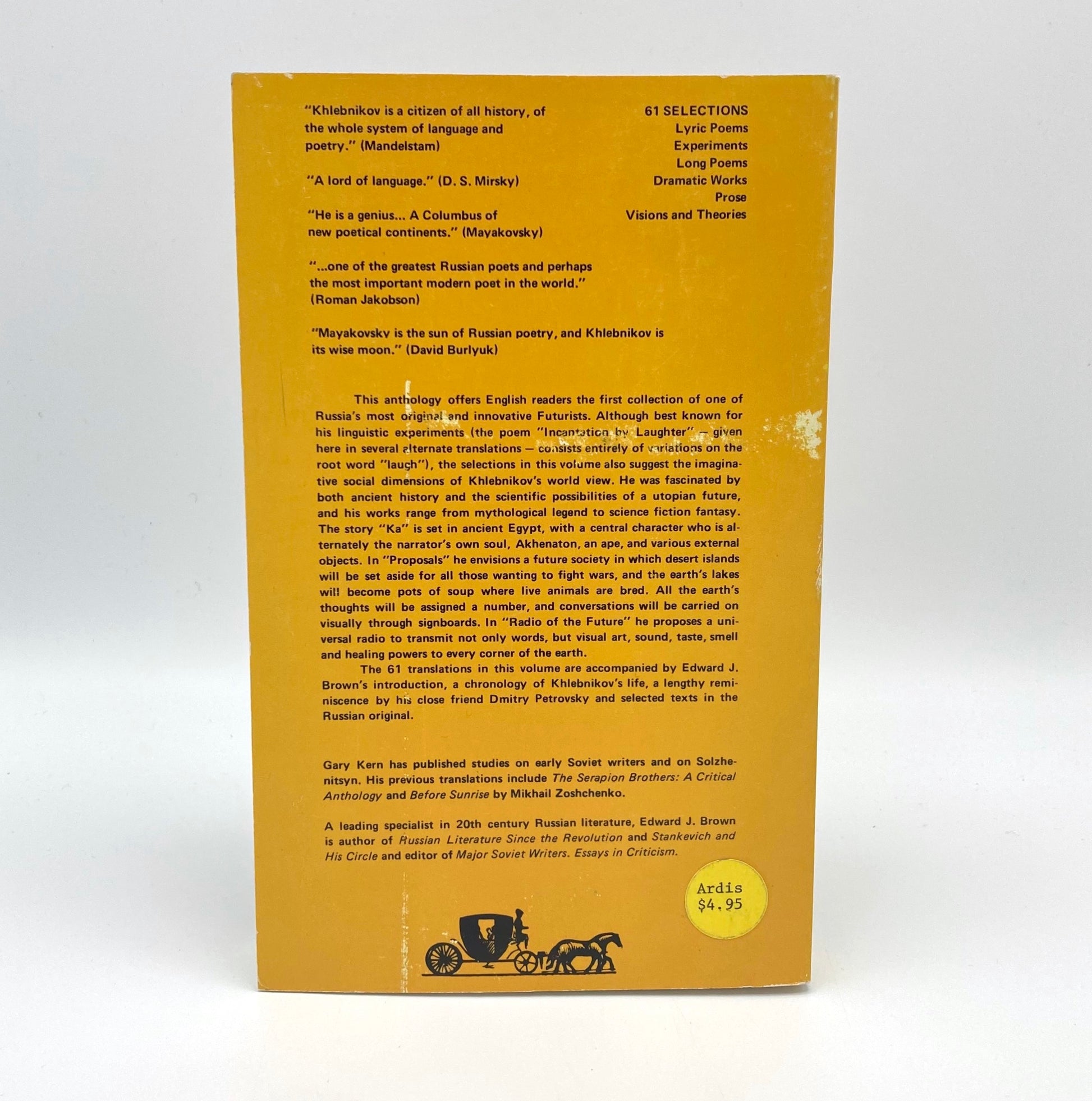 Edited by Gary Kern. Introduction by Edward J. Brown. Translated by Gary Kern, Richard Sheldon, Edward J. Brown, Neil Cornwell, and Lily Feiler. The first comprehensive anthology in English on Klebnikov’s writing. Texts are organized in the following sections: Poetry, Experiments, Long Poems, Dramatic Works, Prose, and Visions and Theories. Includes three appendices, which includes dates in Khlebnikov’s life, A Tale About Khlebnikov by Dmitry Petrovsky, and a selection of texts in Russian.