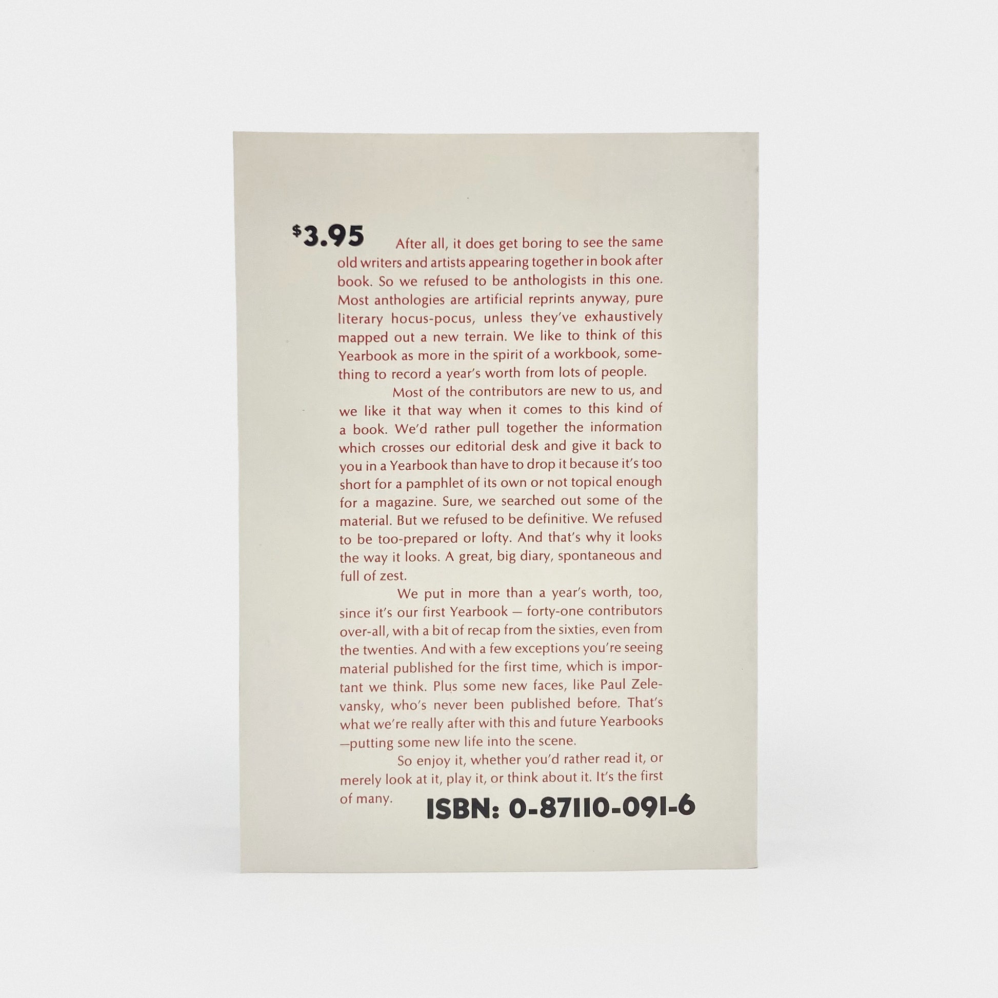 Book measures 5.75 x 8 inches. A very eclectic and interesting anthology by Something Else Press including contributons by Clark Coolidge, Dick Higgins, John Giorno, Yukata Ishii, Alison Knowles, Pauline Oliveros, Wolf Vostell, Jean-Francois Bory, Charles Bukowski, Raoul Hausmann, Bernadette Mayer, S. Clay Wilson, Francis Picabia, and many others.