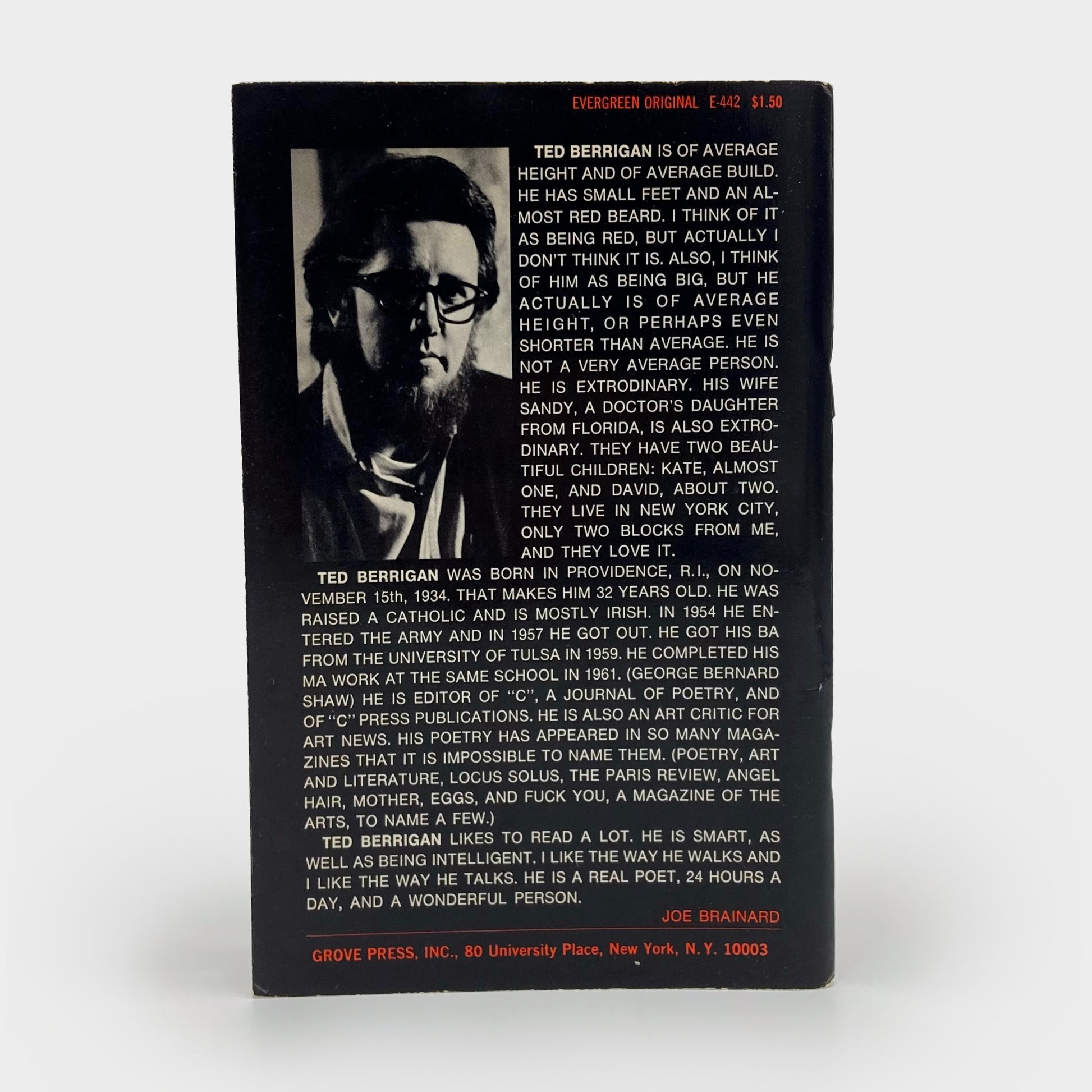 Stapled wrappers. Stated First Printing of Berrigan’s important early book of poems. Cover art by Joe Brainard. The second issue of this volume after Berrigan’s original C Press mimeograph issue. Near Fine in bright wrappers showing minimal signs of wear to edges.