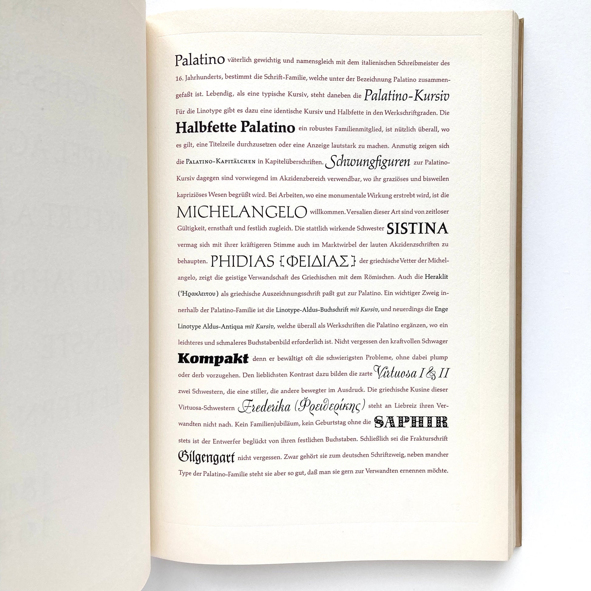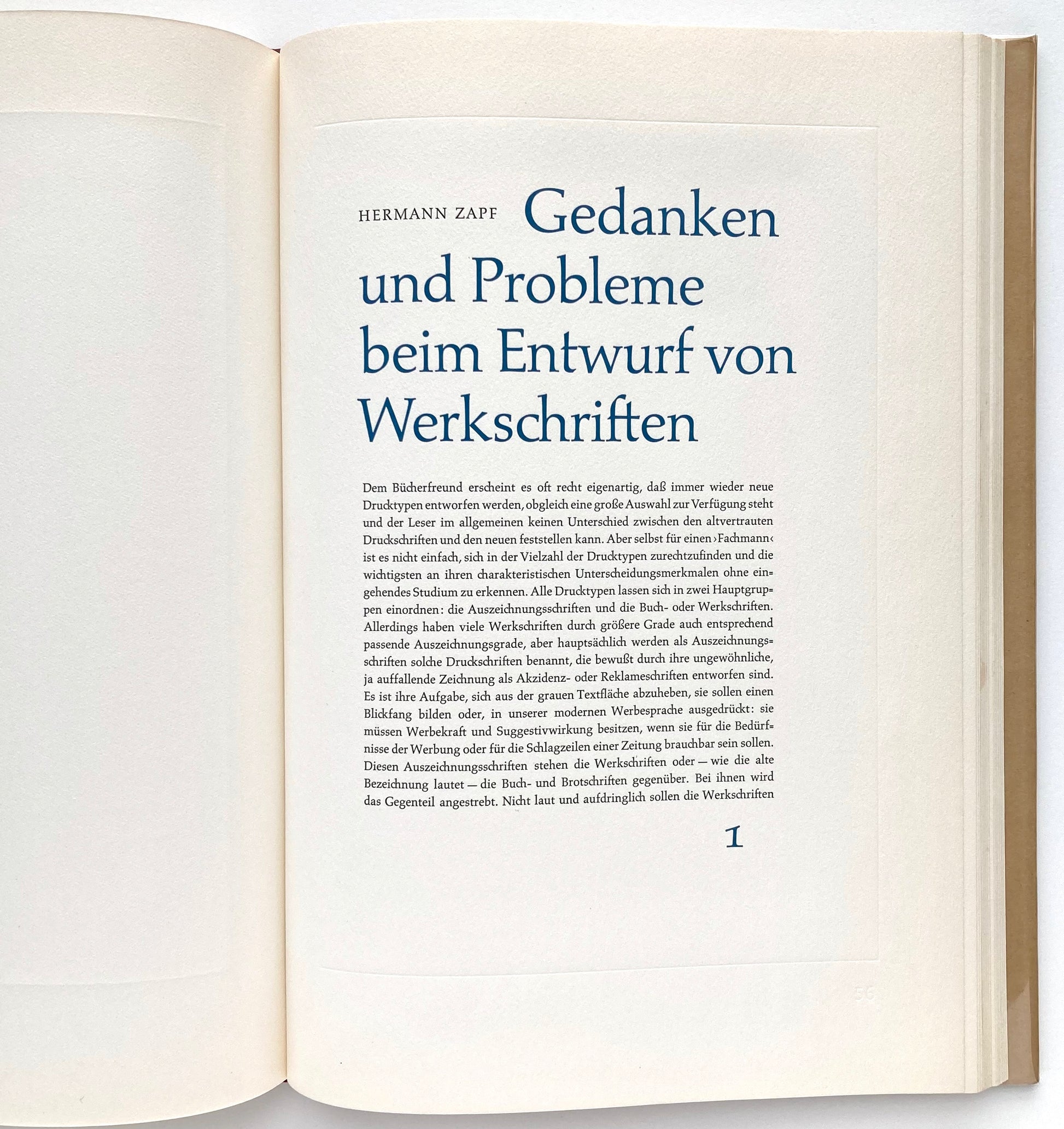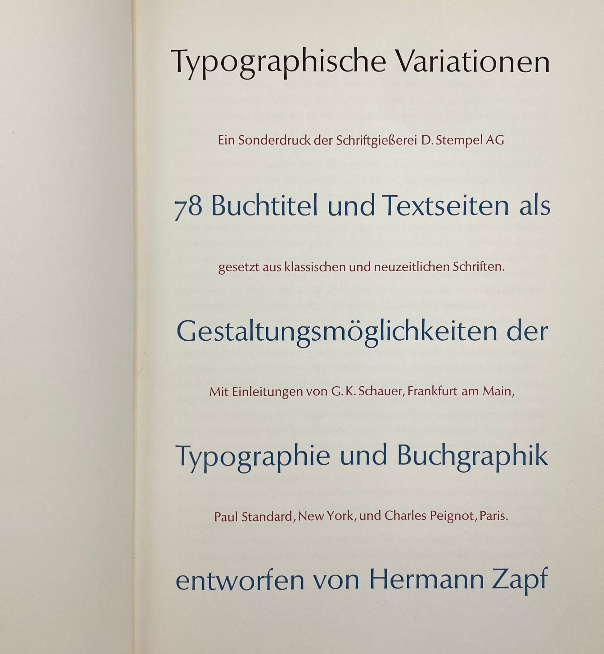 Book measures 8.5 x 12.25 inches. Paper-covered boards with gilt lettered leather spine label. No dust jacket as issued. Published in an edition of 500 copies in this binding, along with an additional 500 copies in half vellum. A selection of 78 text and title pages designed by Zapf. Many of the examples in this volume are from actual books designed by Zapf over the prior couple of decades, and some are typographical exercises by Zapf specifically for this publication. Cast entirely from Stempel typefaces (many of which are Zapf designs) including Palatino, Michelangelo, Virtuosa, Sistina, Optima, Melior, Janson, and others. A truly inspiring book and excellent Stempel type specimen as well.