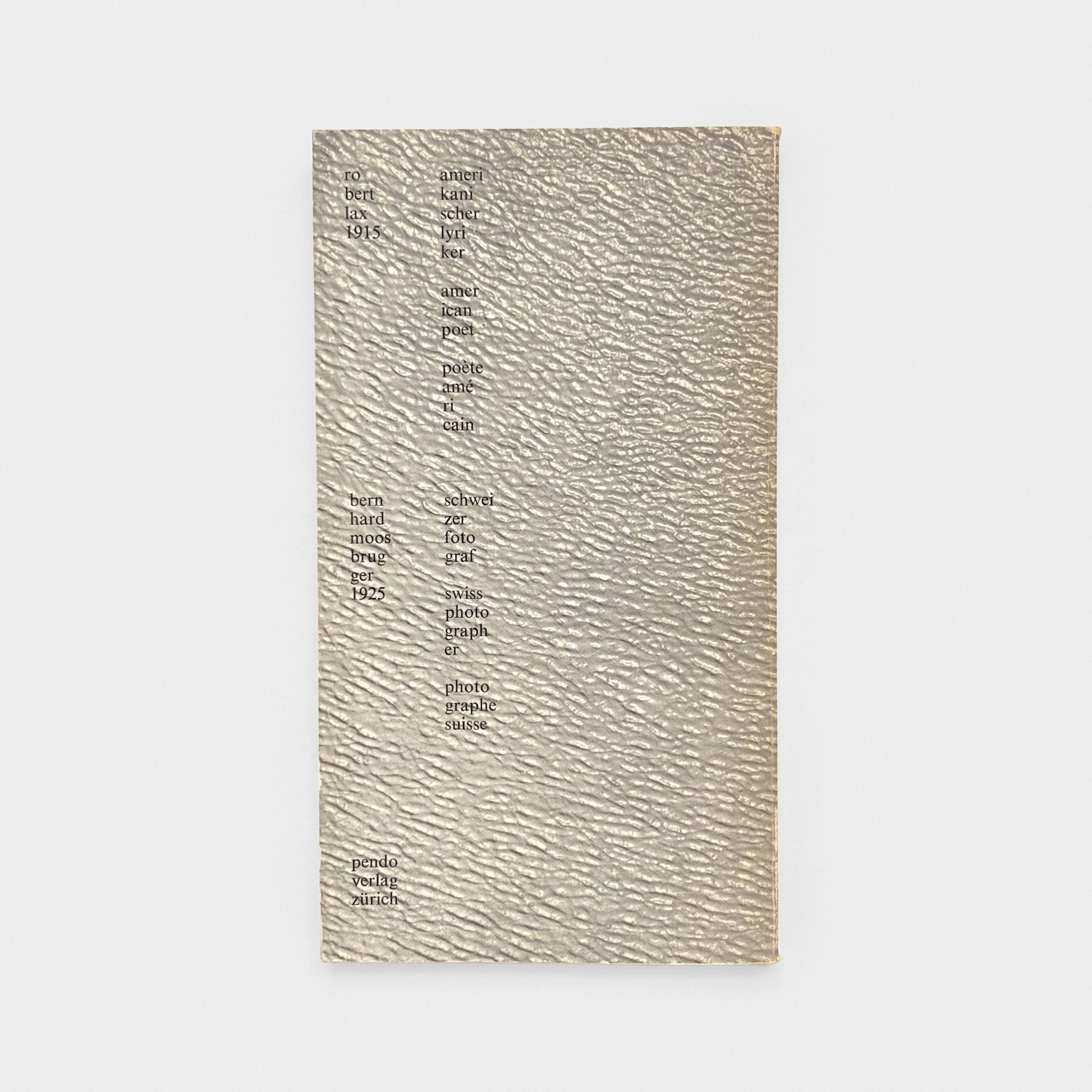 Book measures 4.5 x 8 inches. Stiff photographic wrappers. Text in English and German translation. Poems by Lax with b&w photographs by the Swiss photographer Bernhard Moosbrug on every recto page facing the poems. Very Good in wrappers showing light wear. Binding is tight. A scarce Lax Pendo volume.